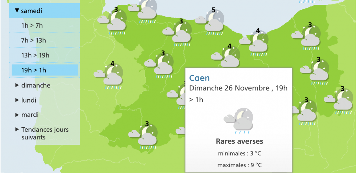 Avec un indice de confiance de 2/5 pour le moment, Météo France prévoit de la pluie sur la région caennaise pour la journée de samedi. Toutefois, ces averses pourraient s'estomper au fil de la soirée. Les températures seront, elles, fraîches puisque comprises entre 3 et 9°.