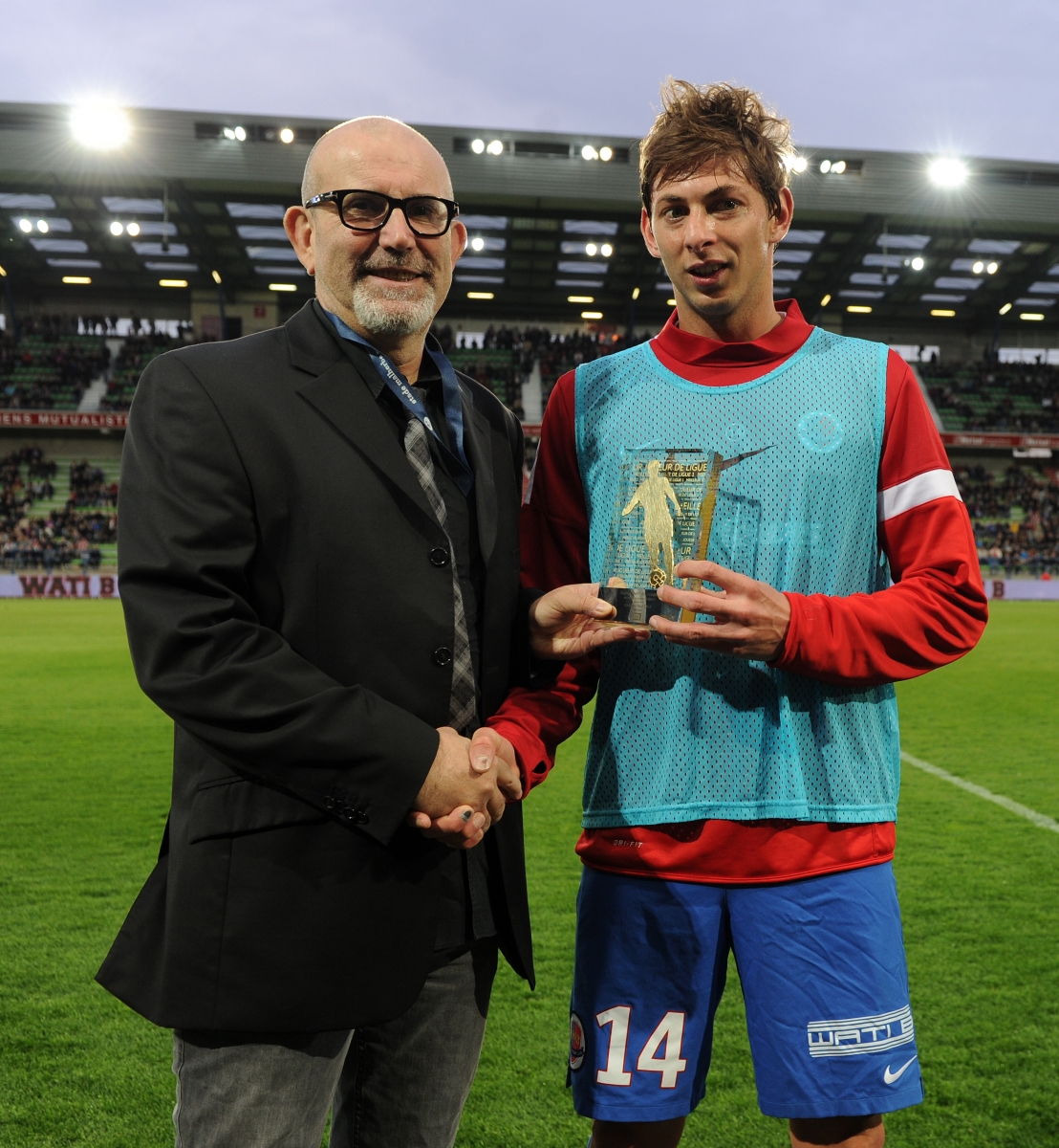 Elu joueur de Ligue 1 du mois de février par l'UNFP, Emiliano Sala, auteur de cinq buts depuis son arrivée en Normandie au mercato hivernal, a reçu son trophée en amont du match SM Caen - Monaco, vendredi 10 avril. Pour rappel, l'attaquant argentin a devancé le Lyonnais Nabil Fekir et son partenaire de club N'Golo Kanté.
